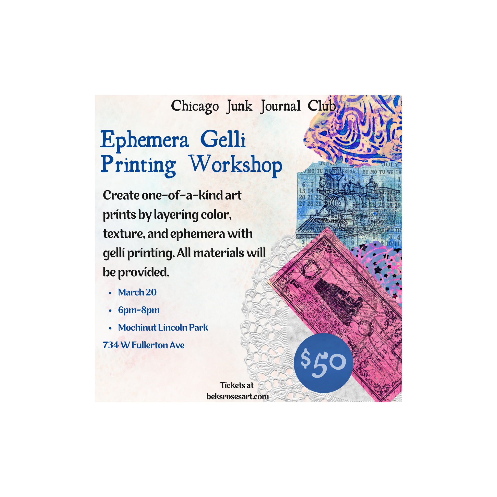 By purchasing a ticket, you agree to participate at your own risk. Chicago Junk Journal Club and its organizers are not responsible for any personal injury, lost or damaged belongings, allergic reactions, or any other incidents that may occur before, during, or after the event.